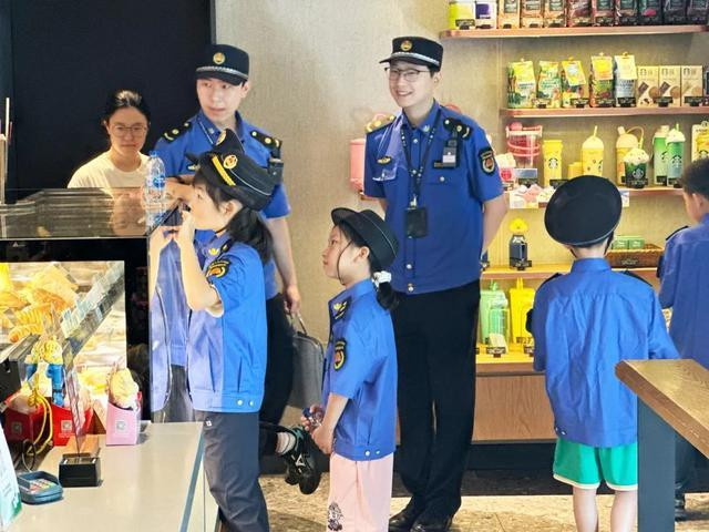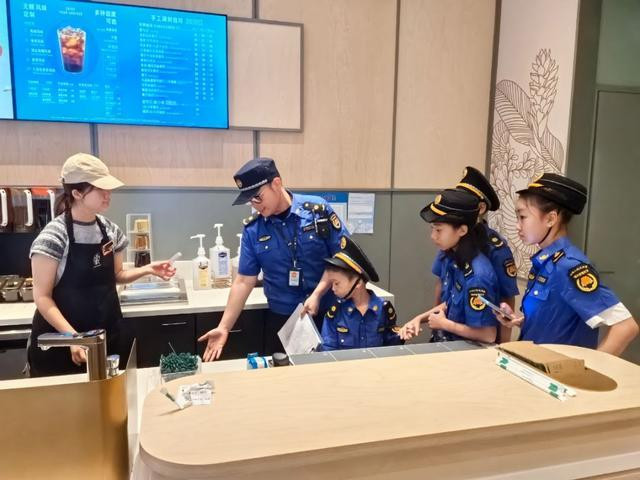 最后是垃圾分类检查。大家走到辖区内一家网红咖啡店的垃圾分类区旁,几个颜色不同的垃圾桶摆放着。孩子们走近,轻轻打开桶盖,认真查看里面投放的垃圾是否符合分类要求。一个“小城管”很快发现了问题:在标着“干垃圾”的桶里,躺着一个明显被茶水浸湿的茶包。“阿姨,这个茶包是湿垃圾,不能放干垃圾桶。”孩子指着茶包对旁边的店员说。店员一看,立刻承认了疏忽,马上将茶包捡出,放进了湿垃圾桶,并对孩子的提醒表示感谢。